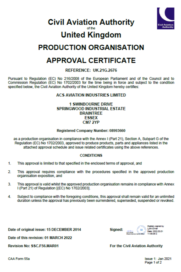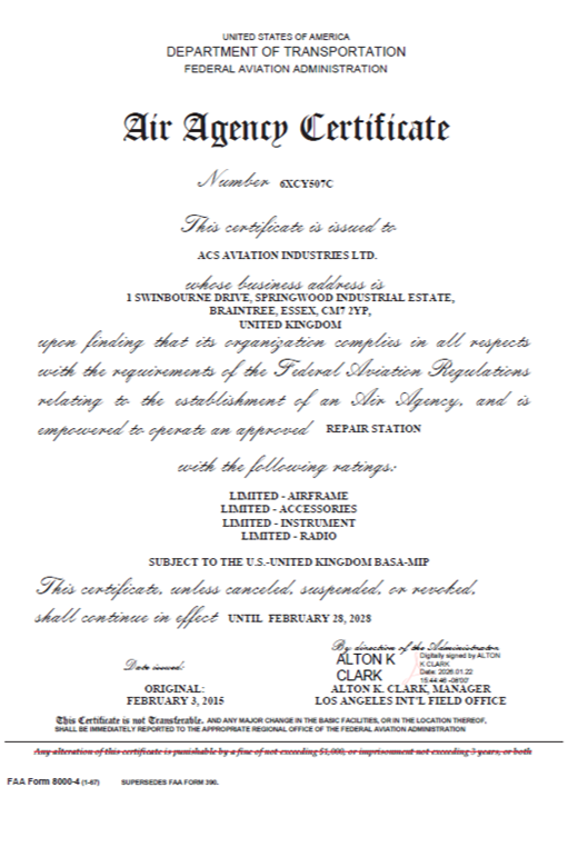 ACS Aviation Industries Ltd is an UK CAA 145, EASA 145, FAA 145, and PART 21G Repair Station.